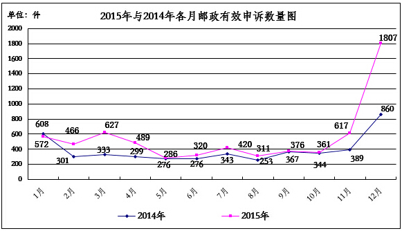 2015年12月,消費者關于郵政服務問題的有效申訴1807件,環比增長192.9%,同比增長110.1%。
