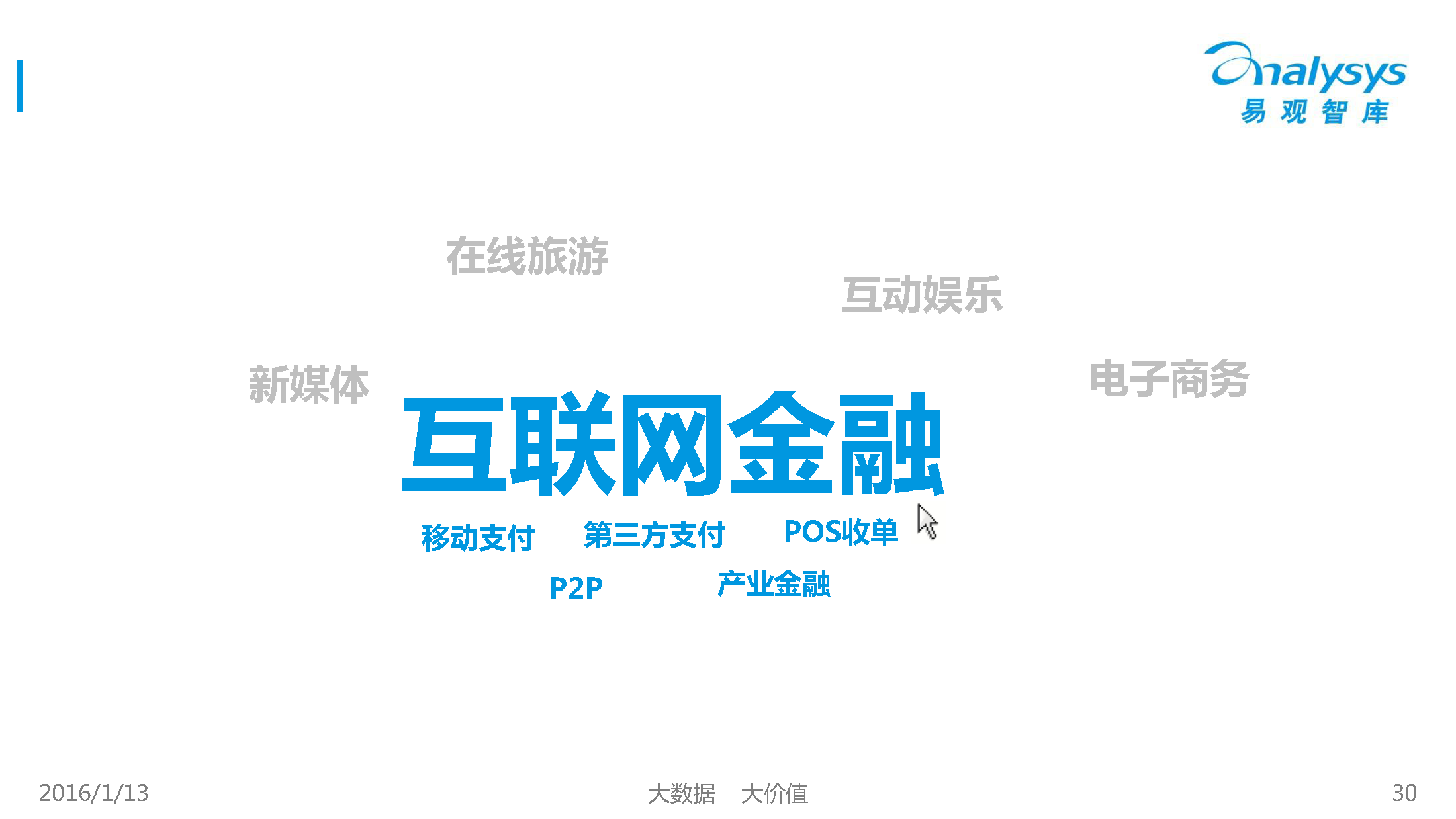 1月13日消息,易觀智庫近日發布了《中國互聯網產業2015趨勢盤點·2016發展預測》,報告涉及了新媒體、在線旅游、互動娛樂、互聯網金融和電子商務五個領域。