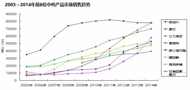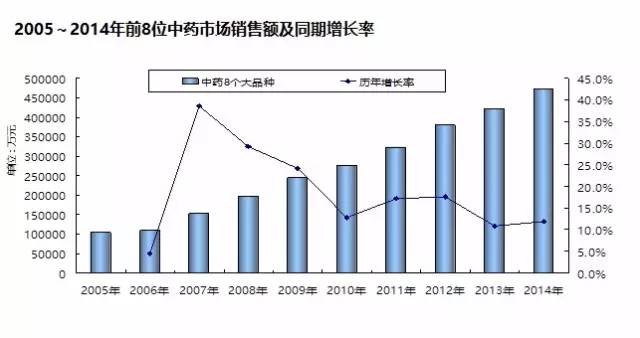 據(jù)樣本醫(yī)院數(shù)據(jù)統(tǒng)計(jì),在排名前100位暢銷產(chǎn)品中,中藥產(chǎn)品有8個(gè)產(chǎn)品列入暢銷藥物名單。上榜藥物分別是:銀杏葉、康艾、三七皂苷、康萊特、穿心蓮內(nèi)酯、醒腦靜、香菇多糖、復(fù)方甘草甜素。其中,前5位產(chǎn)品都是銷售額5億~8億元的大品種。2014年,上述8個(gè)產(chǎn)品在國內(nèi)22個(gè)城市樣本醫(yī)院用藥總金額為47.2億元,與2013年相比增幅為11.8%,較2013年的10.9%略有增長。