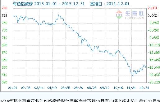2015年整個有色行業的價格指數整體呈斷崖式下跌12月有小幅上揚走勢,截止12月28日,有色指數634點,較年初的769點跌135點,跌幅為21.29%(其中,最高點為5月6日的的773點,最低點為11月24日的607點)。生意社監測數據顯示,12月28日生意社BCI初值為-0.32,均漲跌幅為-1.01%,反映該月制造業經濟較上月呈收縮狀態,經濟有下行風險。