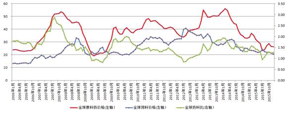 12月份國際原料奶價格和飼料價格均出現下跌,但飼料價格跌幅更大,奶農盈利空間有所擴大,反映奶農盈利空間的指標—奶料比回升至1.28,比2012年7月的歷史低點0.85高50.8%。