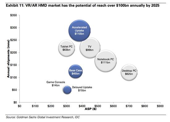 高盛預計,虛擬現實10年內將創收1100億美元,而電視機僅為990億美元。
