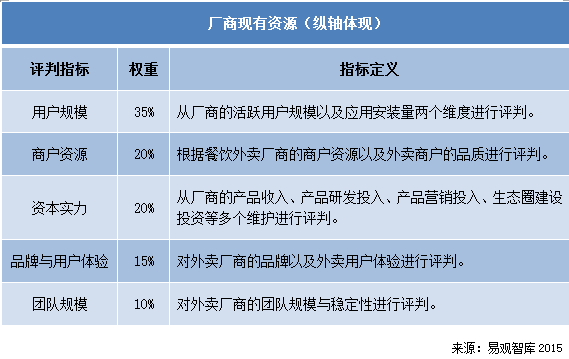 Analysys易觀智庫分析認為,目前許多外賣廠商都相繼完成了新一輪的高額融資,在資本的推動下中國互聯網餐飲外賣市場必將掀起新一輪的激烈競爭以及資源上的博弈。而用戶規模、商戶資源、資本實力、品牌與用戶體驗、團隊規模則是評價廠商現有資源能力的重要指標。