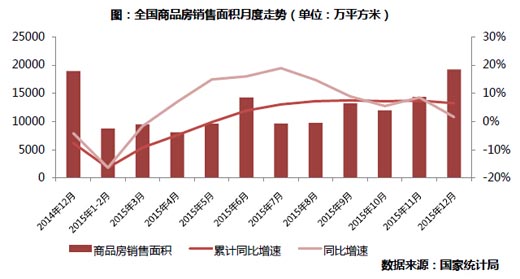 2015年,商品房銷售面積128495萬平方米,比上年增長6.5%,增速比1-11月份回落0.9個百分點。全年銷售面積未能像市場預期一樣沖擊2013年高點。中部地區、西部地區銷售增速較高,東北地區銷售不振,下降24.5%。從全年走勢看,在3月商品房銷售降幅持續收窄,1-5月銷售額同比由負轉正后,三季度銷售面積開始同比正增長,實現了2014年年初以來的首次雙雙正增長,四季度在政策刺激力度加碼作用下,銷售面積增速加速上行,但12月增速有所放緩。