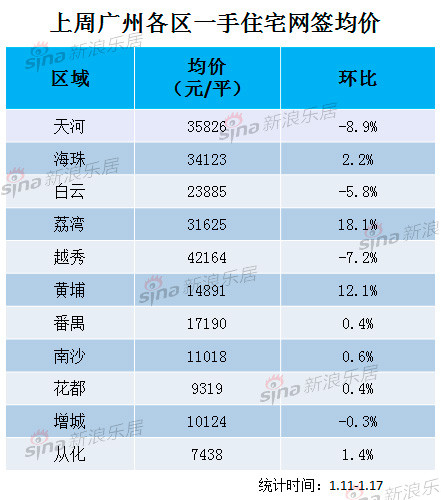 受此影響,成交量持續(xù)回落,上周(1.11-1.17)廣州市一手住宅網(wǎng)簽量1662套,自12月底攀上三千套高峰后,連續(xù)三周呈下滑態(tài)勢(shì)。另一方面,網(wǎng)簽均價(jià)觸底反彈,重返1.5萬(wàn)元/平關(guān)口。