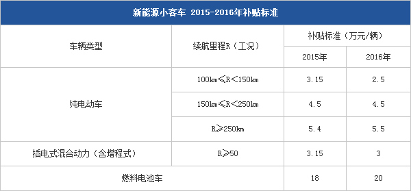 關于新能源車的國家補貼部分,在2016年發生了一些改變,除了純電動汽車續航里程的起始里程從2015年的80公里增加至100公里外,在具體的補貼數額上也有一些調整。另外,參照國家標準的變化,地方上的財政補貼也會有所調整,我將會在后文具體城市部分提及。