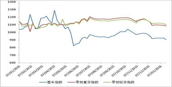 各車型指數環比均有所回落,其中整車指數明顯高于零擔指數;零擔指數降幅高于零擔重貨指數。本周,整車指數為906.2點,比上周回落2.1%,同比回落15.0%;零擔輕貨指數為1101.9點,比上周回落1.4%,但同比回升1.9%;零擔重貨指數為1082.0點,比上周回落1.05%,同比回落1.5%。
