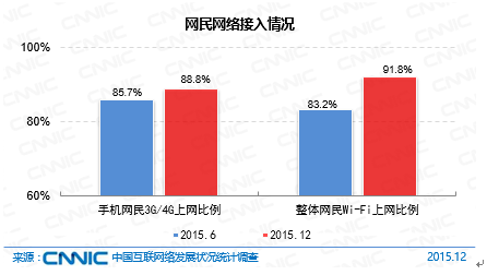 截至2015年12月,91.8%的網(wǎng)民最近半年曾通過(guò)Wi-Fi無(wú)線網(wǎng)絡(luò)接入互聯(lián)網(wǎng),較2015年6月增長(zhǎng)了8.6個(gè)百分點(diǎn)。隨著“智慧城市”、“無(wú)線城市”建設(shè)的大力開展,政府與企業(yè)合作推進(jìn)城市公共場(chǎng)所、公共交通工具的無(wú)線網(wǎng)絡(luò)部署,公共區(qū)域無(wú)線網(wǎng)絡(luò)日益普及;手機(jī)、平板電腦、智能電視等無(wú)線終端促進(jìn)了家庭無(wú)線網(wǎng)絡(luò)的使用,Wi-Fi無(wú)線網(wǎng)絡(luò)成為網(wǎng)民在固定場(chǎng)所下的首選接入方式。