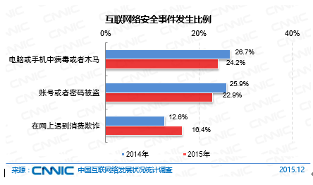 2015年,42.7%的網(wǎng)民遭遇過(guò)網(wǎng)絡(luò)安全問(wèn)題,較2014年底下降了3.6個(gè)百分點(diǎn)。在安全事件中,電腦或手機(jī)中病毒或木馬情況最為嚴(yán)重,發(fā)生率為24.2%,其次是賬號(hào)或密碼被盜,發(fā)生率為22.9%,這兩類安全事件的發(fā)生率與2014年底相比均有所下降。同時(shí),隨著網(wǎng)絡(luò)購(gòu)物群體的不斷增大,網(wǎng)絡(luò)消費(fèi)安全問(wèn)題明顯上升。2015年,在網(wǎng)上遭遇到消費(fèi)欺詐比例為16.4%,較2014年提升了3.8個(gè)百分點(diǎn)。