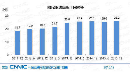 2015年,中國(guó)網(wǎng)民的人均周上網(wǎng)時(shí)長(zhǎng)為26.2小時(shí),與2014年基本持平。