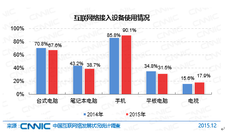 網(wǎng)民個(gè)人上網(wǎng)設(shè)備進(jìn)一步向手機(jī)端集中,手機(jī)上網(wǎng)比例不斷增長(zhǎng),臺(tái)式電腦、筆記本、平板電腦的上網(wǎng)比例則呈下降趨勢(shì)。截至2015年12月,我國(guó)網(wǎng)民中,使用手機(jī)上網(wǎng)的比例為90.1%,較2014年底增長(zhǎng)了4.3個(gè)百分點(diǎn),其中僅通過(guò)手機(jī)上網(wǎng)的網(wǎng)民占18.5%,較2014年底提升了3.2個(gè)百分點(diǎn);使用臺(tái)式電腦、筆記本電腦、平板電腦上網(wǎng)的比例分別為67.6%、38.7%、31.5%,較2014年底均下降了4個(gè)百分點(diǎn)左右。電視作為家庭娛樂(lè)上網(wǎng)設(shè)備,網(wǎng)民使用率為17.9%,較2014年底增長(zhǎng)了2.3個(gè)百分點(diǎn)。