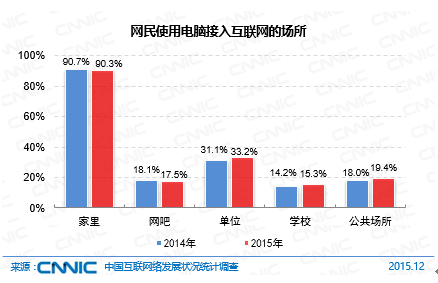 截至2015年12月,我國(guó)網(wǎng)民在家里通過(guò)電腦接入互聯(lián)網(wǎng)的比例為90.3%,與2014年底相比基本持平,在單位、學(xué)校、公共場(chǎng)所通過(guò)電腦接入互聯(lián)網(wǎng)的比例均有小幅上升,在網(wǎng)吧上網(wǎng)的比例略有下降,為17.5%。