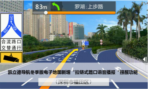 新增拉鏈式路口語音播報及路口放大圖提醒功能是凱立德C-Car版冬季系列的一大亮點。語音播報一直是導航產品必不可少的功能,是在駕駛過程中最符合駕駛者習慣和駕駛環境的重要功能。凱立德C-Car版冬季系列結合最新交通規則將拉鏈式路口行駛規則寫入導航系統,并使用語音播報,旨在幫助提醒用戶在遇到拉鏈式路口時注意交替通行,免受違章罰單困擾;同時,還可有效的降低路口擦碰事故,提高出行效率。