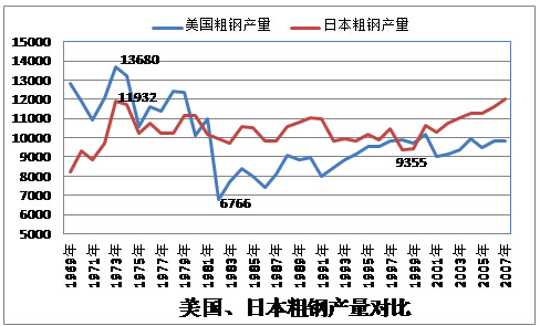 美國、日本雙雙于1973年粗鋼產量達到最高值,分別為13680萬噸和11932萬噸。在隨后的30年里,兩國鋼鐵產量調整形態呈現較大差異。美國1982年產量降至6766萬噸后,產量底部回升,2000年最高產量回升至10180萬噸。把三十年分兩個階段進行比較,前十年平均年產量10713萬噸,后二十年平均年產量8971萬噸,下降了16.3%。粗鋼產量總體呈下臺階走勢。日本于1998年降至9355萬噸,此后最高產量回升至11051萬噸,前十年平均年產量10529萬噸,后二十年平均年產量10288萬噸,下降2.3%,下臺階特征不顯著,可視為呈區間波動。兩國比較不難得出結論:美日鋼鐵產量下降的路徑和幅度差異較大。
