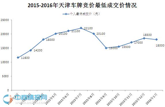 由上表可知,2016年1月天津市小客車車牌增量指標競價,個人最低成交價為18000元。與去年相比起點較高。今年車牌競價成價走勢如何?十分值得期待。回顧去年,天津小客車車牌競價的個人最低成交價從2月起就呈上升趨勢,一直維持到7月才有所下降。天津7月車牌競價的個人最低成交價為最高,達22100元。而9月的車牌競價個人最低成交價大幅度下滑,降至15000元。9月以后天津市小汽車車牌競價最低成交價穩步上漲,漲至12月的18500元。這跟國家9月份推出1.6L及以下小汽車購置稅減半的政策有關。