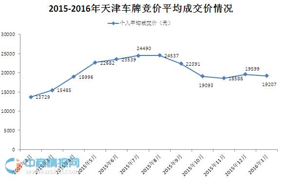2015年2月-2016年1月天津小客車車牌個人競價情況如下: