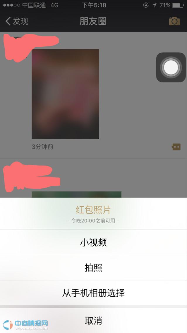 3.點擊朋友圈右上角的照相按鈕,可看到三個選項,即紅包照片、照片和小視頻,而紅包照片就是新玩法啦。