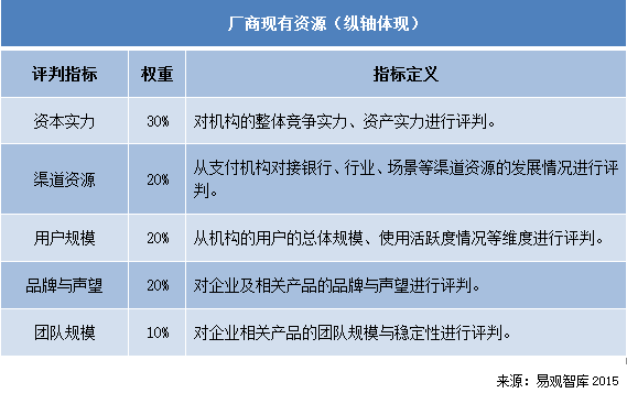 Analysys易觀智庫分析認為,中國第三方移動支付市場巨大的潛力使得眾多第三方支付機構競相入場,而資本實力、渠道資源、用戶規模、品牌與聲望、團隊規模則是評價廠商現有資源能力的重要指標。