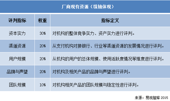 Analysys易觀智庫分析認為,中國第三方互聯網在線支付市場格局基本已定,其中資本實力、渠道資源、用戶規模、品牌與聲望、團隊規模是評價廠商現有資源能力的重要指標。