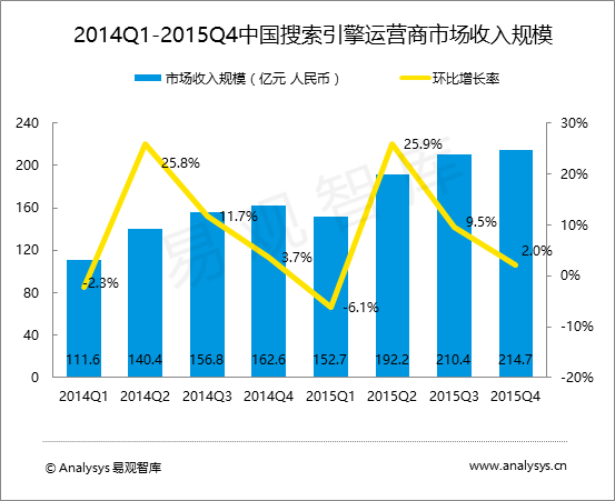 易觀智庫(kù):2015年四季度中國(guó)搜索引擎市場(chǎng)規(guī)模達(dá)214.7億