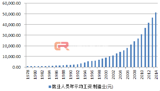 1978-2014年中國制造業(yè)就業(yè)人員平均工資連年上漲