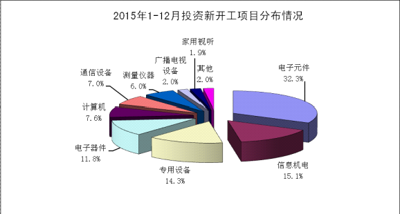 1-12月,電子信息產業新開工項目9614個,同比增長19.76%。其中,通信設備行業新開工項目數量同比增長32.74%,廣播電視設備行業同比增長18.99%,電子計算機行業同比增長35.87%,家用視聽設備行業同比增長3.93%,電子器件行業同比增長6.7%,電子元件行業同比增長20.64%,電子測量儀器行業同比增長11.63%,電子工業專用設備行業同比增長22.07%,電子信息機電行業同比增長24.44%。