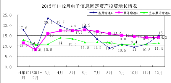 1-12月,電子信息產業500萬元以上項目完成固定資產投資額13775.3億元,同比增長14.2%。1-12月,電子信息產業新增固定資產9658.9億元,同比增長20.6%。