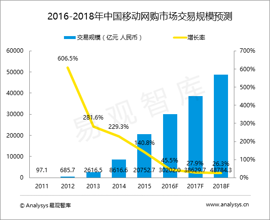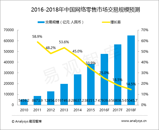 核心提示: 根據Analysys易觀智庫預測數據顯示,2015年中國網絡零售市場規模將達到38351.7億元人民幣,較2014年增長33.9%。預計到2018年,中國網絡根據Analysys易觀智庫預測數據顯示,2015年中國網絡零售市場規模將達到38351.7億元人民幣,較2014年增長33.9%。預計到2018年,中國網絡零售市場規模將達到約6.5萬億元人民幣。