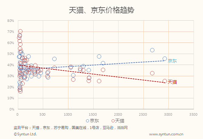 星圖數據D-Matrix數據矩陣監測的2015年全年數據中,包括家電、手機、個護化妝、乳制品等在內的53個線上主要品類的平均成交價顯示,隨著品類均價升高,消費者更傾向于在京東上購買,均價降低,消費者更傾向于在天貓上購買。具體來說,在500元以內,品類的均價越低,天貓的份額越高,京東的份額越低,但兩者之間的差距很小,而超過500元之后,價格越高,天貓份額下滑,京東份額上升,且兩者之間的份額差距越來越大。