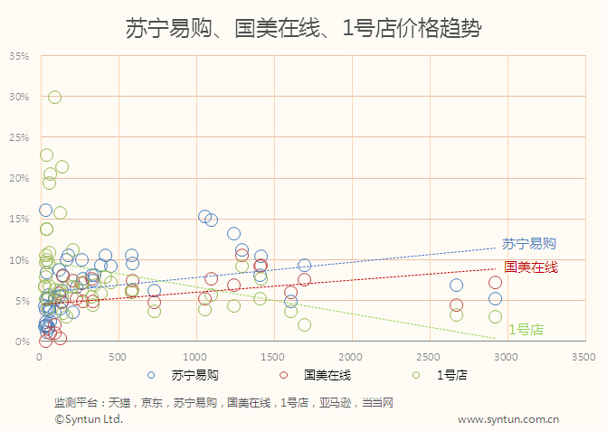 在同時間段、同品類的監測上,隨著價格的升高,1號店的份額下降,蘇寧易購和國美在線的份額都呈現上升趨勢。具體來說,均價在500元以內的品類,1號店占比最高近30%,均價越低,消費者越愿意在“網上超市”購買商品,均價越高,消費者在1號店的購買意愿也越來越低。顯然,1號店“網上超市”的定位并沒有拉動其大家電品類的銷售,1號店在大家電的平臺競爭中不占優勢。