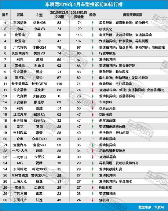 本月車質網接到的有效投訴信息共涉及375個車系,相比去年12月增加了3個,其中投訴量達2位數的車系有88個,比上月增加了4個。東風標致408、中華V3以及比亞迪秦的投訴量占據了當月所有車系的前三。