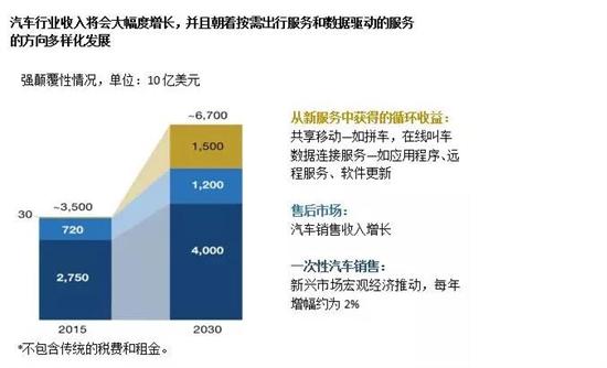 汽車行業(yè)收入將會大幅度增長,并且朝按需出行服務(wù)和數(shù)據(jù)驅(qū)動的服務(wù)等方向多樣化發(fā)展。這將使得汽車銷售收入在2030年額外增加1.5萬億美元,相當于提升30%。而同期傳統(tǒng)的汽車銷售和售后產(chǎn)品、服務(wù)收入將達5.2萬億美元,比2015年的3.5萬億美元提高50%。