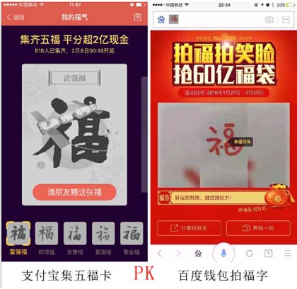 實(shí)際上,春節(jié)紅包的商業(yè)化和營(yíng)銷意圖本無(wú)可厚非,2014年微信紅包的一炮而紅便是一個(gè)例證。但從去年開(kāi)始,支付寶加入紅包大戰(zhàn),阿里和騰訊之間的屏蔽戰(zhàn)就已經(jīng)充滿了硝煙的味道,今年百度錢包的參戰(zhàn)更是刺激了阿里和騰訊的強(qiáng)勢(shì)布局,支付寶的五福紅包便是其中一個(gè)產(chǎn)物。