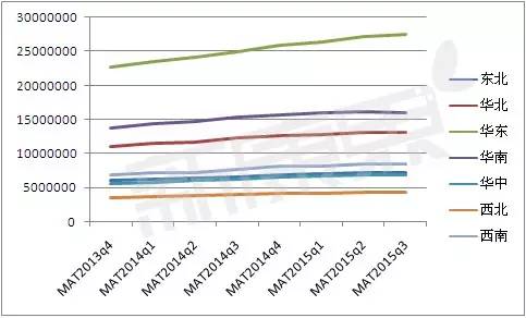 分地區來看,目前國內醫院藥品銷售額最大的地區是華東地區,包括安徽、上海、江蘇、浙江、山東、江西等5省1市,MAT2015Q3醫院藥品銷售金額2755億元,占全國的比例高達32.95%,同比MAT2014Q3增長9.66%,而全國平均水平只有8.2%,從藥品銷售MAT趨勢圖來看,未來還有很強的增長潛力。