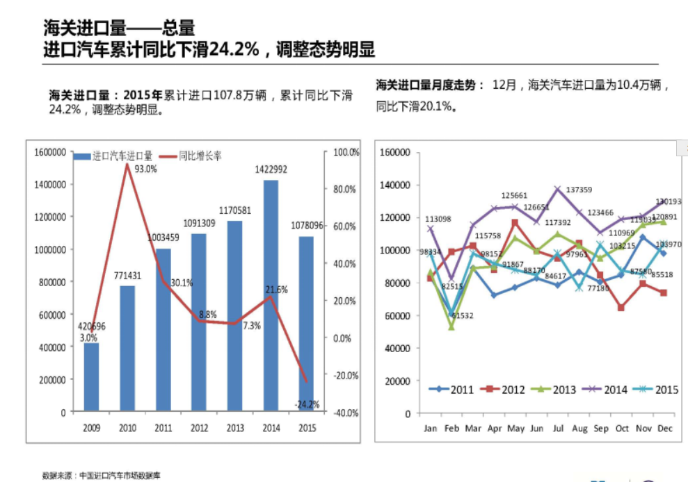 核心提示: 國機汽車股份有限公司近日發布的《中國進口汽車市場月度報告》(2015-12)顯示:2015年,進口汽車海關進口量為107.8萬輛,同比下降24.2%,調整態勢國機汽車股份有限公司近日發布的《中國進口汽車市場月度報告》(2015-12)顯示:2015年,進口汽車海關進口量為107.8萬輛,同比下降24.2%,調整態勢明顯。