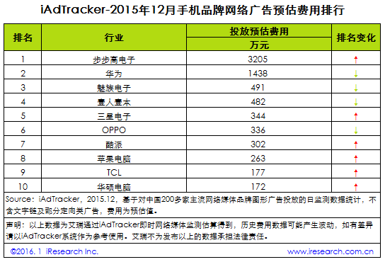 2015年12月手機品牌網絡廣告投放費用達8649萬元