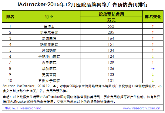 核心提示: iResearch艾瑞咨詢根據(jù)網(wǎng)絡(luò)廣告監(jiān)測系統(tǒng)iAdTracker的最新數(shù)據(jù)研究發(fā)現(xiàn),2015年12月,醫(yī)院品牌網(wǎng)絡(luò)廣告總投放費用達3432萬元。其中,痘博士iResearch艾瑞咨詢根據(jù)網(wǎng)絡(luò)廣告監(jiān)測系統(tǒng)iAdTracker的最新數(shù)據(jù)研究發(fā)現(xiàn),2015年12月,醫(yī)院品牌網(wǎng)絡(luò)廣告總投放費用達3432萬元。其中,痘博士投放費用達552萬元,位居第一;伊美爾美容投放費用達285萬元,位居第二;愛康國賓投放費用達164萬元,位居第三。