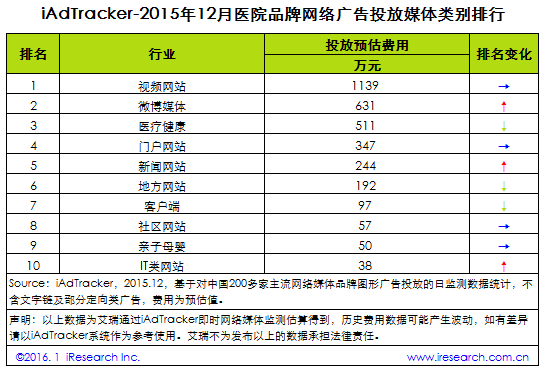 艾瑞iAdTracker最新數(shù)據(jù)顯示,2015年12月,醫(yī)院品牌網(wǎng)絡(luò)廣告主投放主要集中在視頻網(wǎng)站、微博媒體和醫(yī)療健康。其中,視頻網(wǎng)站投放費用達1139萬元,占總投放費用的33.2%;微博媒體投放費用達631萬元,占總投放費用的18.4%;醫(yī)療健康投放費用達511萬元,占總投放費用的14.9%。