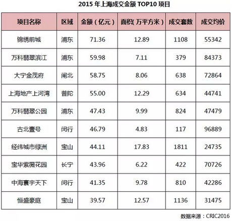 2015年前十入榜的金額有了明顯提升,門檻提高到了39.57億元,最高已經(jīng)達到71.36億元。前三名分別是錦繡前程、萬科翡翠濱江和大寧金茂府。總體來說,上海熱銷項目入榜金額對比北京有所上升,整體還是低于深圳。