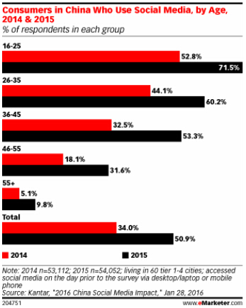 研究表明,2015年,中國社交媒體的使用行為發生在所有年齡段。16歲到25歲的消費者仍然是最多使用社交媒體的群體,同比增長18.7%。有趣的是,36—45歲的消費者群體也增勢迅猛,一年內增幅超過20%。而55歲及以上的消費者群體的社交媒體使用率增長了4.7個百分點,增幅接近一倍。