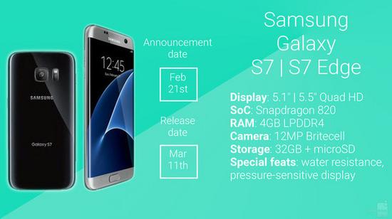 另外,三星S7/S7 edge將搭載驍龍820處理器,內(nèi)置4GB RAM+32GB ROM,支持存儲(chǔ)卡擴(kuò)展,后置1200萬像素?cái)z像頭,相機(jī)傳感器尺寸為1/2.5,同時(shí)該機(jī)還將配備音質(zhì)效果不錯(cuò)的揚(yáng)聲器,支持防水功能等。三星S7 /S7 edge將于巴塞羅那當(dāng)?shù)貢r(shí)間2月21日正式發(fā)布,并會(huì)在3月11日上市。