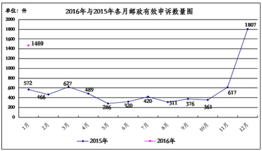 2016年1月,消費者關于郵政服務問題的有效申訴1469件,環比下降18.7%,同比增長156.8%。