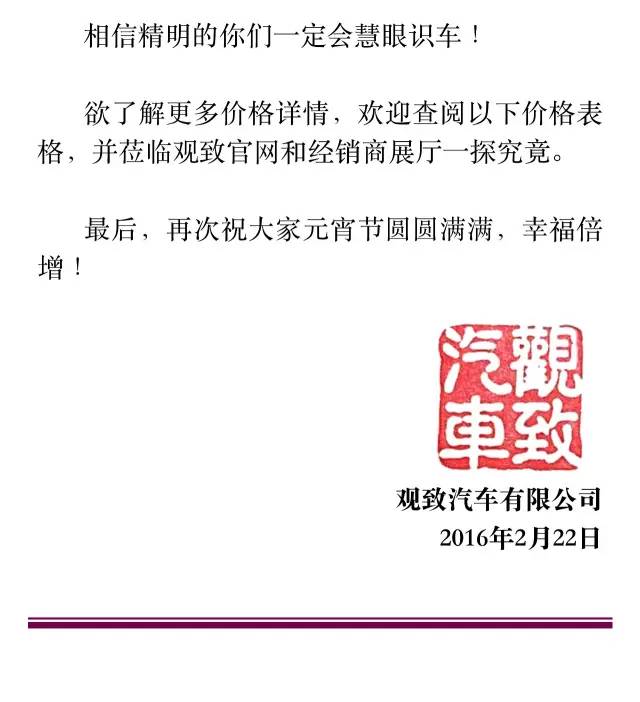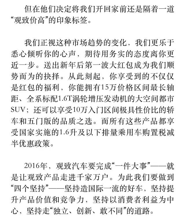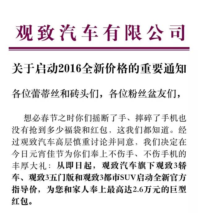 核心提示:昨日,觀致汽車發(fā)布通知:即日起,觀致3轎車、觀致3五門版以及觀致3都市SUV將啟動(dòng)全新官方指導(dǎo)價(jià),為消費(fèi)者帶來(lái)“最高達(dá)2.6萬(wàn)元的巨型紅包”。
