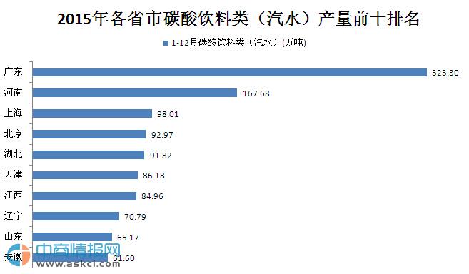2015年全國(guó)碳酸飲料類(lèi)(汽水)產(chǎn)量前十排名:廣東第一