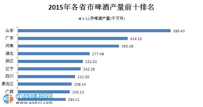 另外,2015年啤酒產量前十的省市分別是山東、廣東、河南、湖北、浙江、遼寧、四川、黑龍江、廣西以及江蘇。各省市產量依次是589.43千萬升、424.15千萬升、390.38千萬升、277.48千萬升、251.02千萬升、242.28千萬升、221.00千萬升、208.14千萬升、200.12千萬升和184.21千萬升。