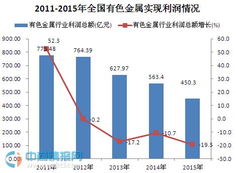 2015年有色金屬礦采選業實現利潤總額為450.3億元,同比下滑19.3%。從2011年-2015年中國有色金屬行業實現利潤總額一直保持下滑的態勢,從2012年開始,有色金屬行業的利潤總額增長率一直處于負增長。