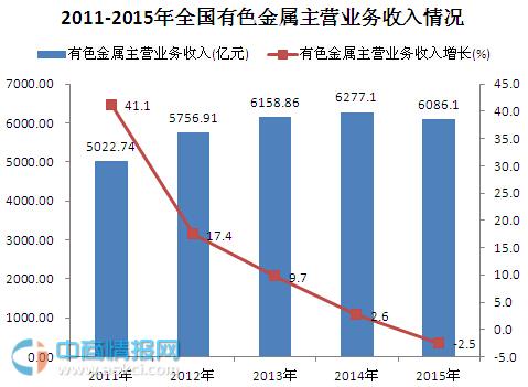 核心提示: 中國產業發展研究網訊:2015年中國有色金屬礦采選業主營業務收入6086.1億元,同比下降2.5%。由上圖可知,2011-2014年全國有色金屬行業主營業務收入一直保