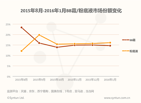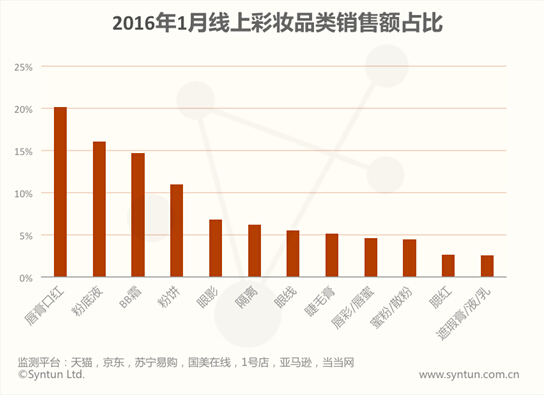 根據星圖數據,2016年1月份,線上彩妝(身體彩妝除外)除唇膏口紅高居龍頭寶座之外,銷售額2-4名的品類均為底妝產品,其中,粉底液更是以行業大哥的身份領先,超過BB霜1.4個百分點,成為最吸金底妝品類。