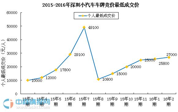 由上表可知,個人車牌競價價格由2015年第4期開始就一直上升了,上升幅度較大。2015年第6期個人最低成交價突破兩萬接近3萬元,環比漲了1.2萬元;2015年第7期個人最低成交價更是以環比增漲2元的速度上升至49100元,接近五萬元。想不到到了第8期深圳小汽車競價個人最低成交價峰回路轉,一個勁跌到10800元,回到第4期前的成交水平。之后2015年第8-11期又穩步上漲至11期的25000元,這或跟2015年9月國家推出1.6L及以上的轎車購置稅減半有關。2016年深圳小汽車車牌競價一直延續去年下半年的穩步上漲態勢,截止2016年2月,小汽車車牌競價已由2015年的第八期的10800元漲至27000元了。