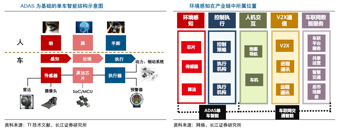 實現汽車的智能化需要感知、決策、執行。形象的類比到人的話感知就是人的眼,處理即是人的腦而控制就如同人的手腳一般。傳感器就是汽車的眼睛,通過攝像頭、毫米波雷達、激光雷達等可以采集汽車周圍環境的如行人、車輛、道路信息等。